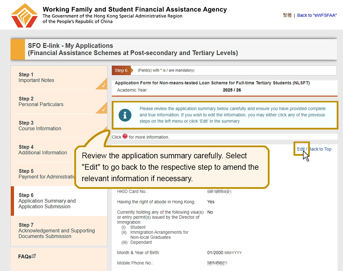 Review the application summary carefully. Select "Edit" to go back to the respective step to amend the relevant information if necessary.