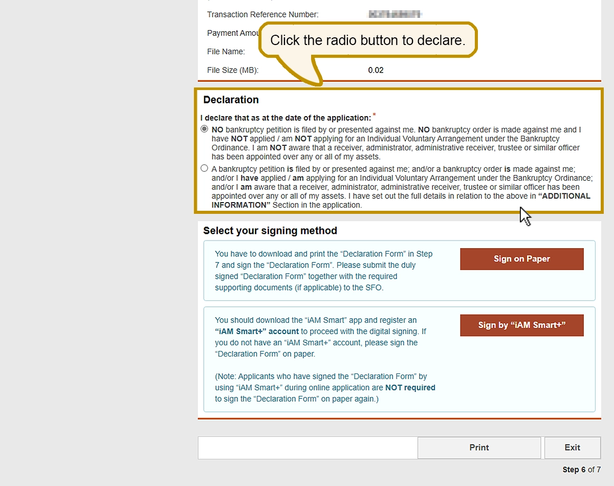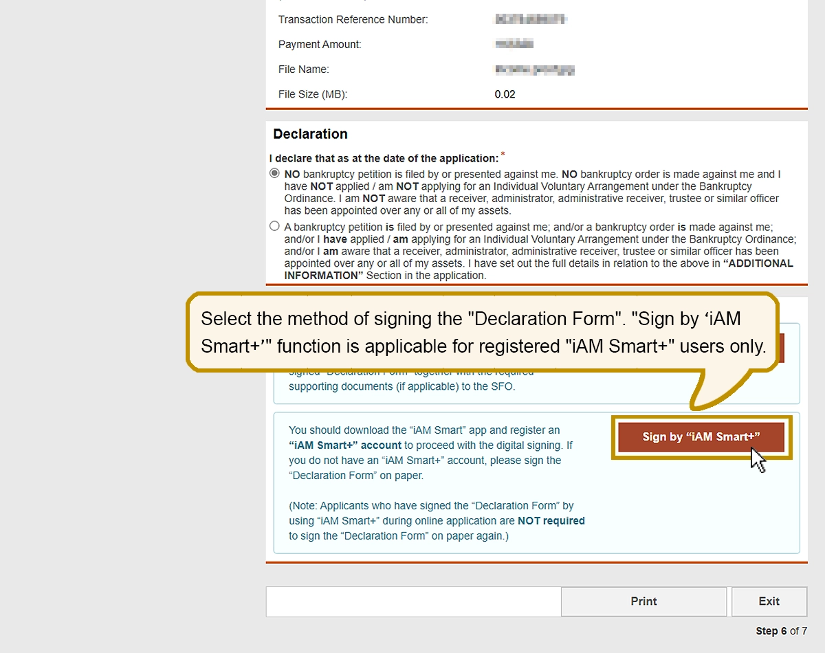 Select the method of signing the "Declaration Form". "Sign by ‘iAM Smart+’" function is applicable for registered "iAM Smart+" users only.