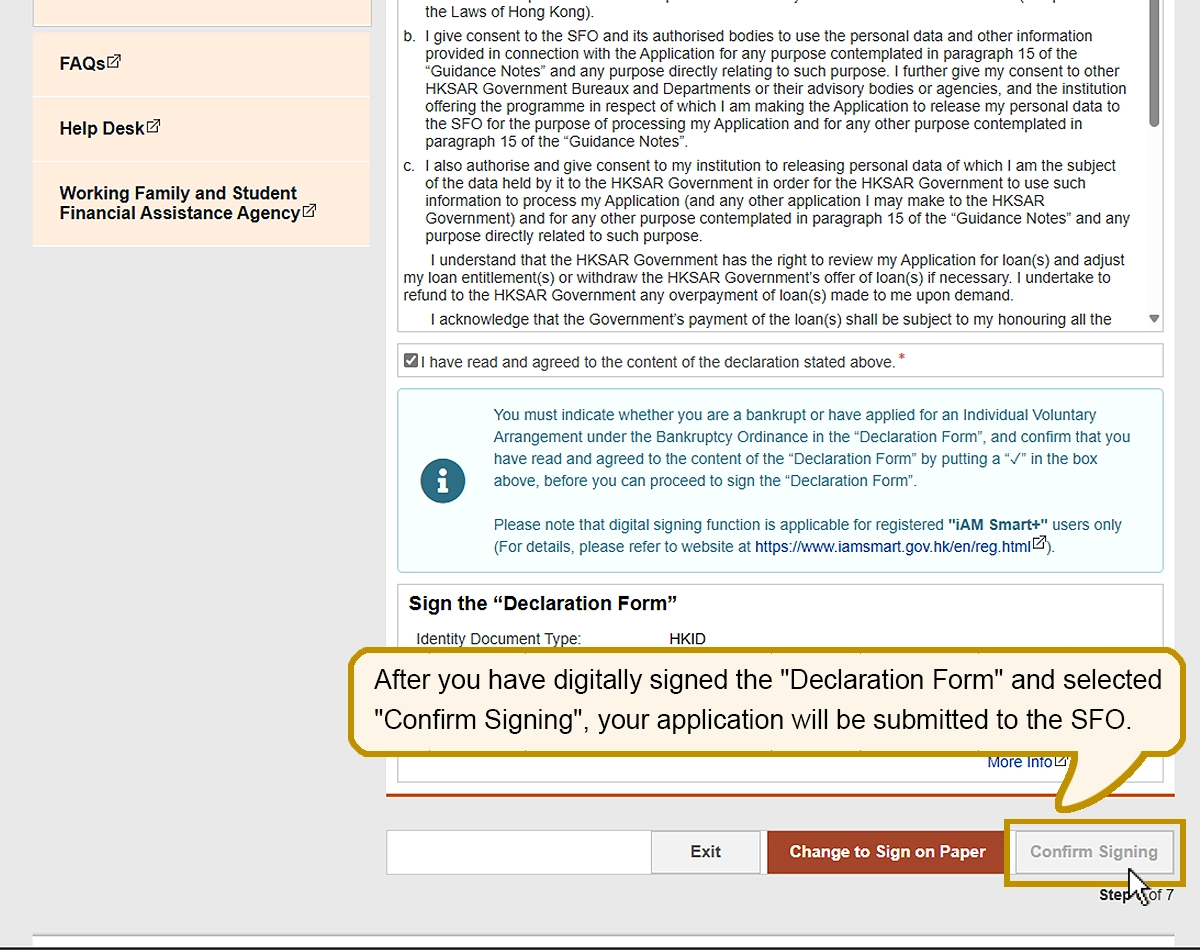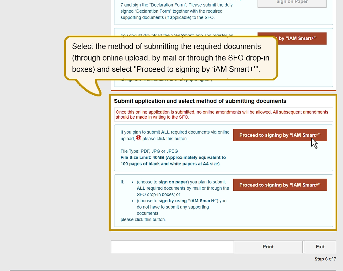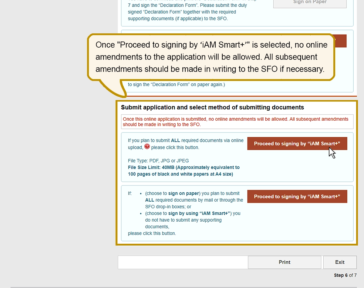 Once "Proceed to signing by ‘iAM Smart+’" is selected, no online amendments to the application will be allowed. All subsequent amendments should be made in writing to the SFO if necessary.