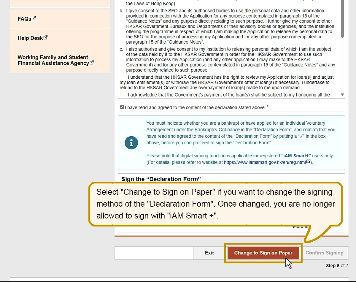 Select "Change to Sign on Paper" if you want to change the signing method of the "Declaration Form". Once changed, you are no longer allowed to sign with "iAM Smart +".