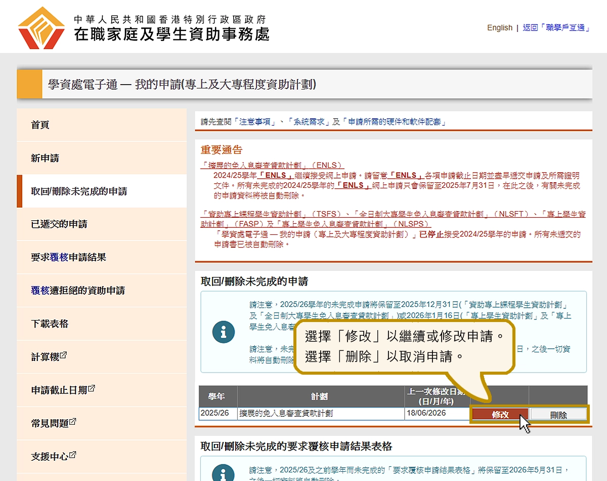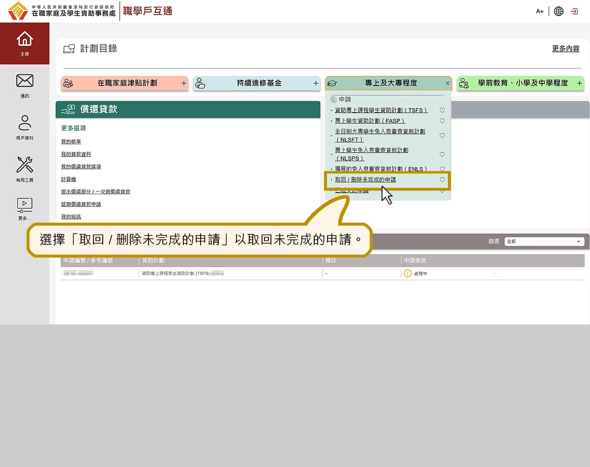 選擇「取回/删除未完成的申請」以取回未完成的申請。