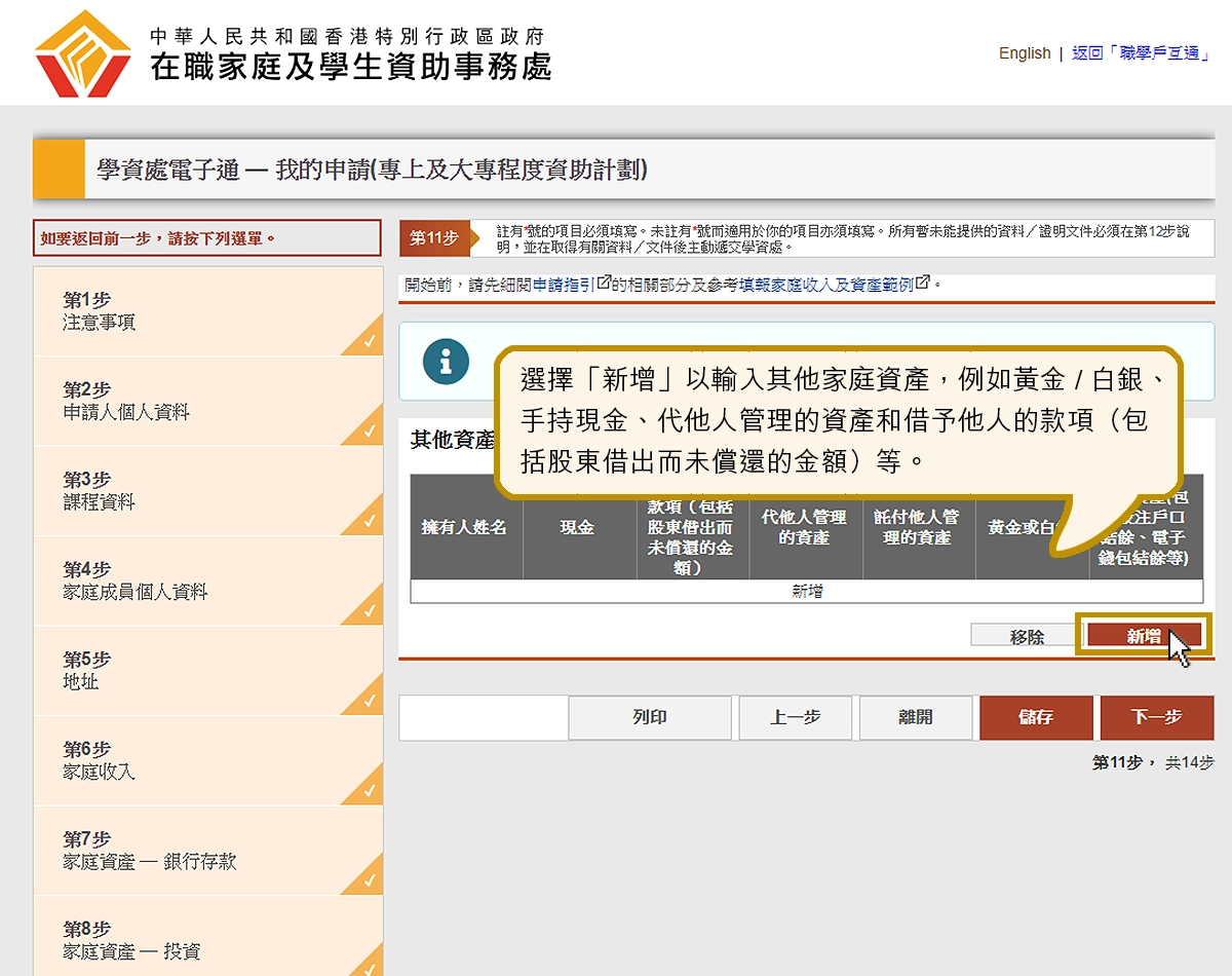 選擇「新增」以輸入其他家庭資產,例如黃金/白銀、手持現金、代他人管理的資產和借予他人的款項(包括股東借出而未償還的金額)等。