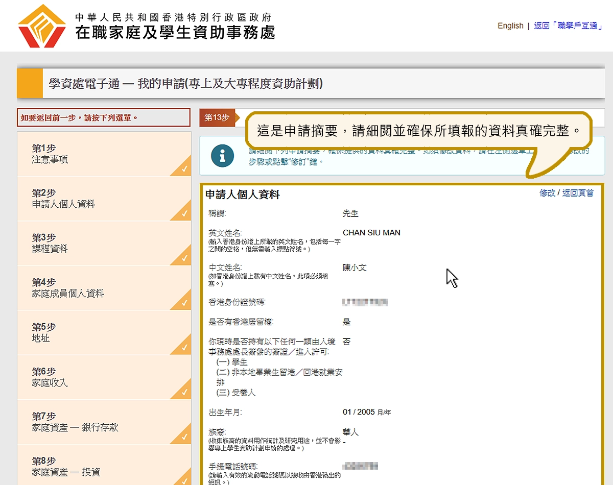 這是申請摘要,請細閱並確保所填報的資料真確完整。