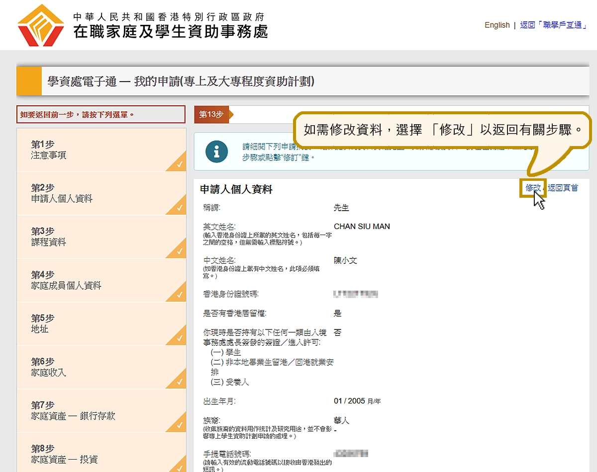申請一經遞交,不得再作修改。如需修改,必須以書面方式向學資處提出。