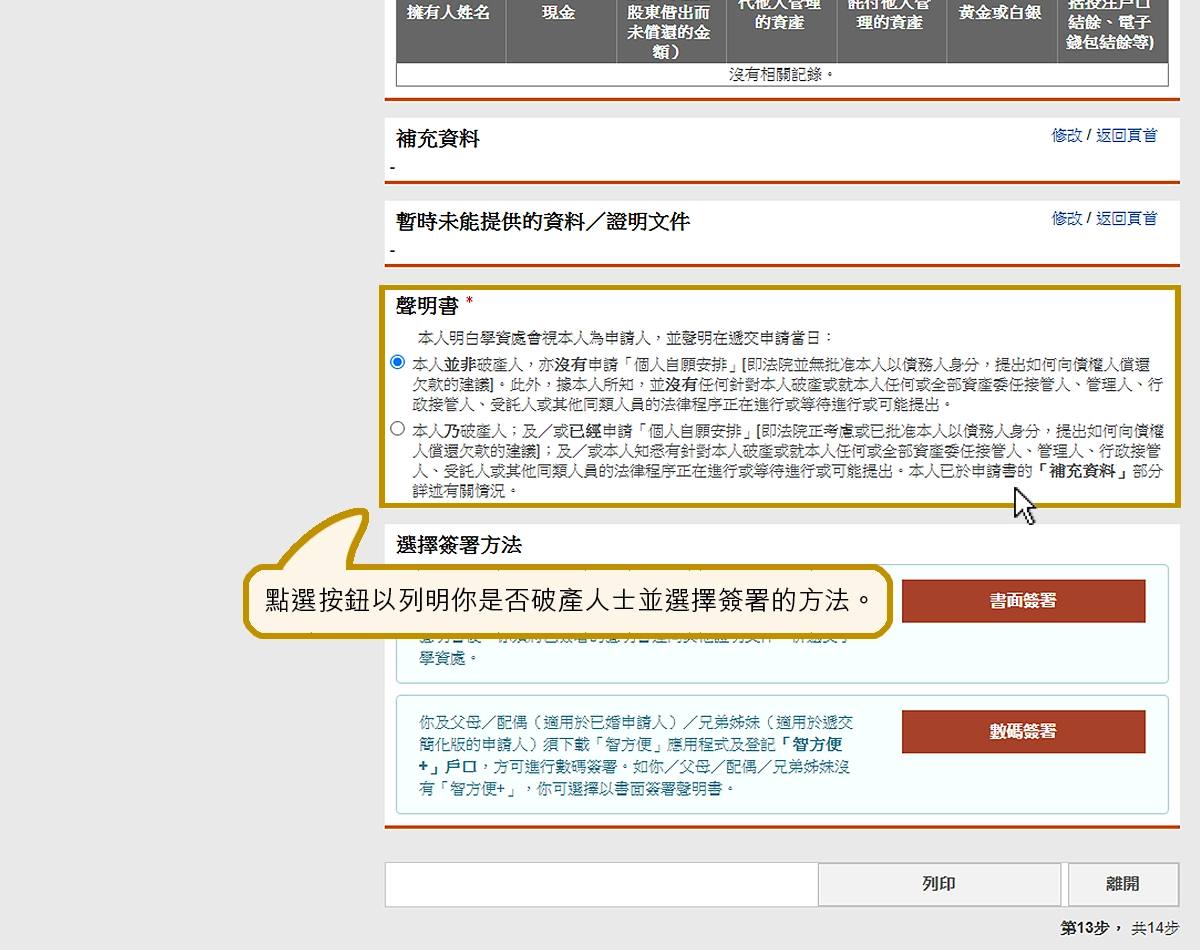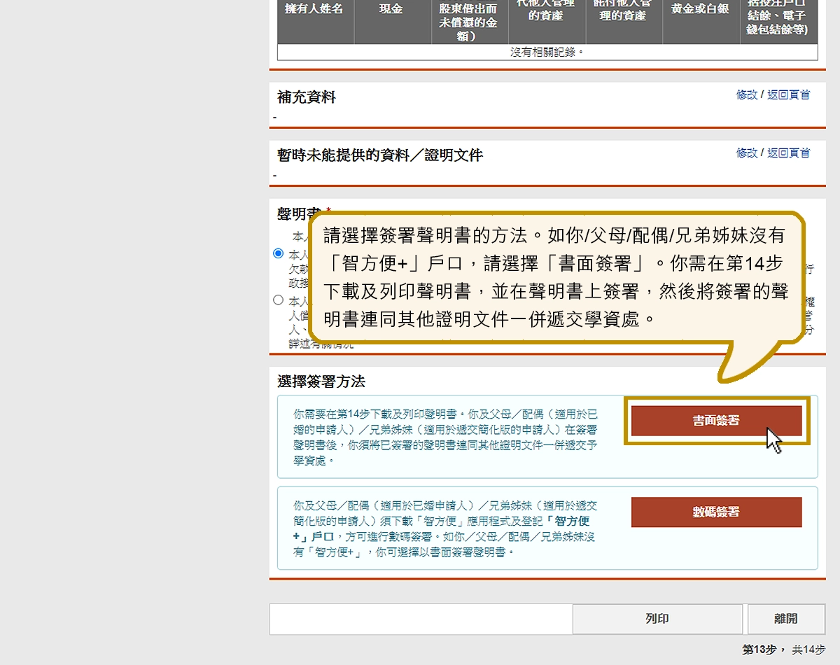 請選擇簽署聲明書的方法。如你/父母/配偶/兄弟姊妹沒有「智方便+」戶口,請選擇「書面簽署」。你需在第14步下載及列印聲明書,並在聲明書上簽署,然後將簽署的聲明書連同其他證明文件一併遞交學資處。