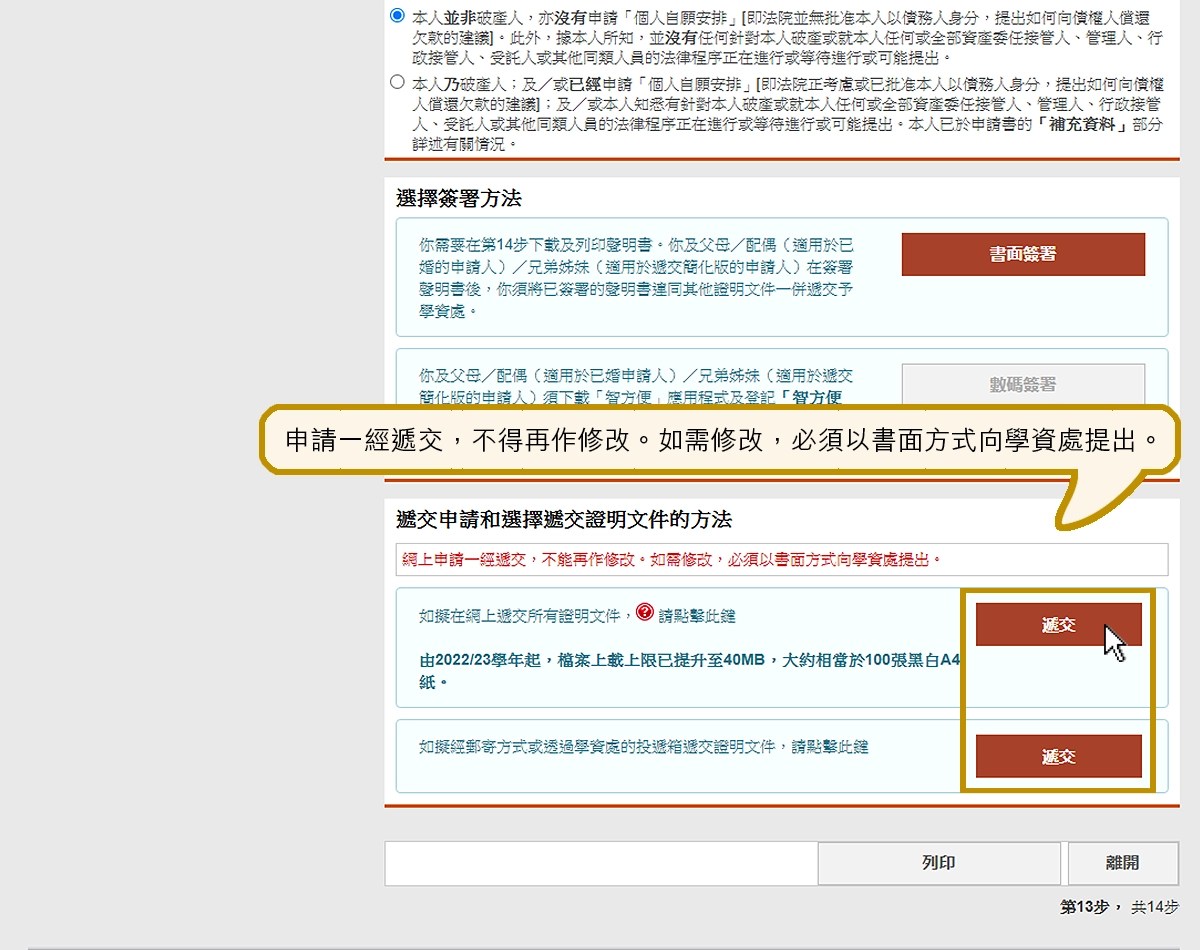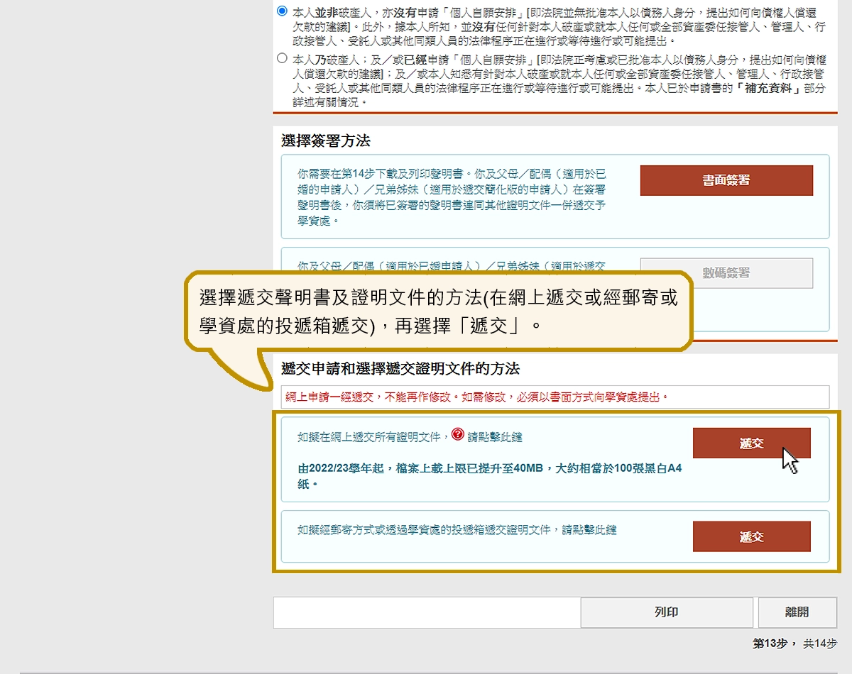 選擇遞交聲明書及證明文件的方法(在網上遞交或經郵寄或學資處的投遞箱遞交),再選擇「遞交」。