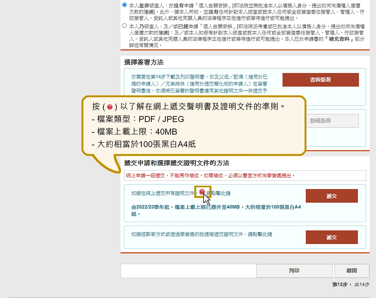 按以了解在網上遞交聲明書及證明文件的準則。 - 檔案類型:PDF / JPEG - 檔案上載上限:40MB - 大約相當於100張黑白A4紙