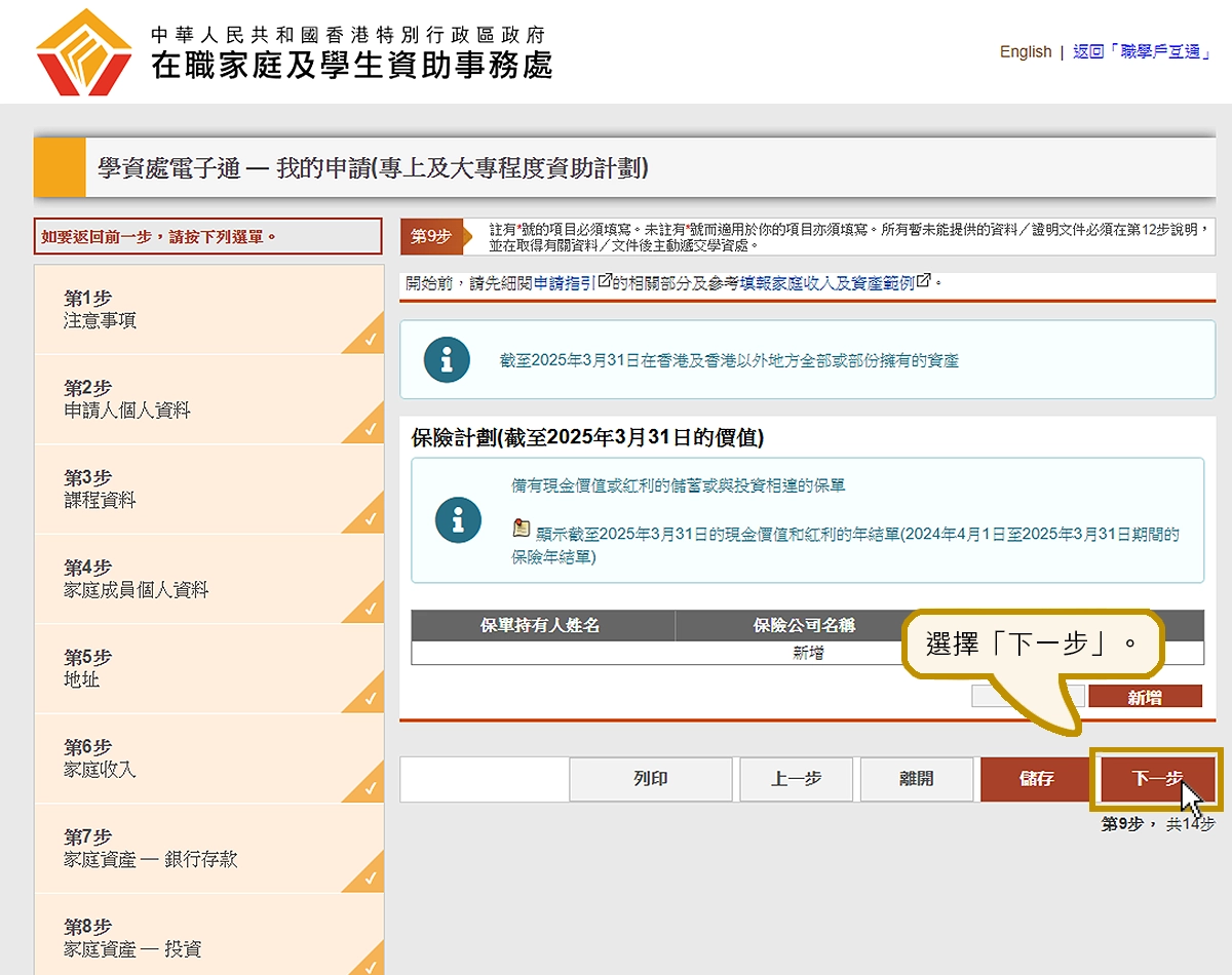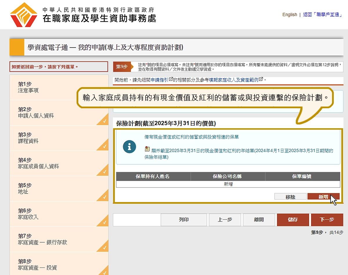 輸入家庭成員持有的有現金價值及紅利的儲蓄或與投資連繫的保險計劃。