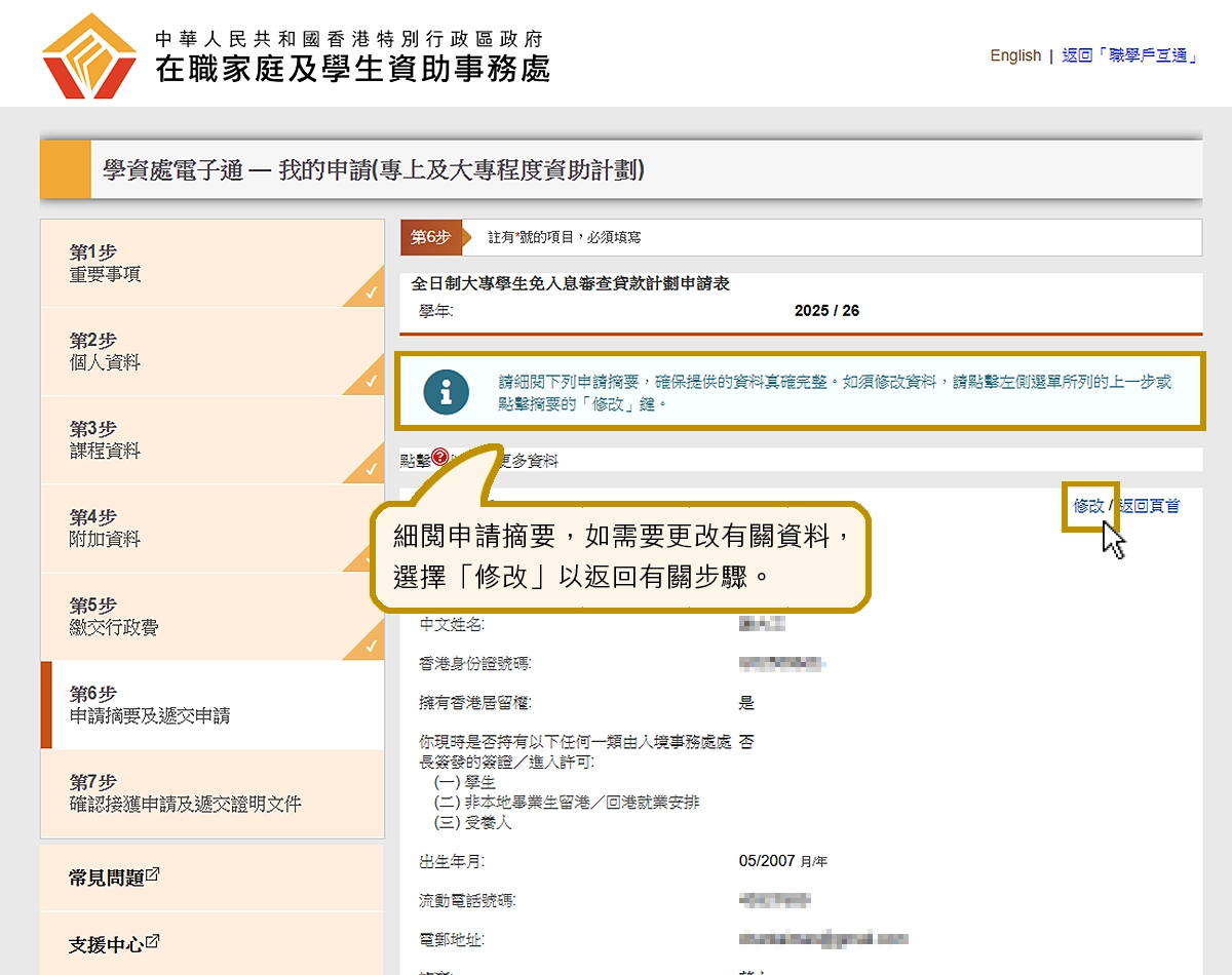 網上申請一經遞交,不得再作網上修改。如需修改,必須以書面方式向學資處提出。