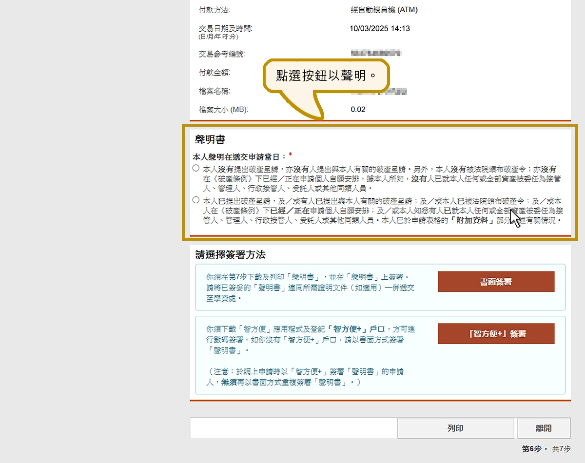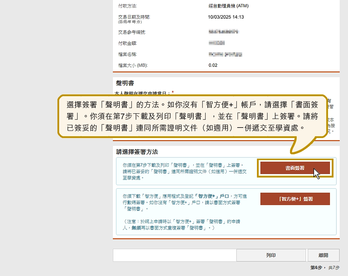 選擇簽署「聲明書」的方法。如你沒有「智方便+」帳戶,請選擇「書面簽署」。你須在第7步下載及列印「聲明書」,並在「聲明書」上簽署。請將已簽妥的「聲明書」連同所需證明文件(如適用)一併遞交至學資處。