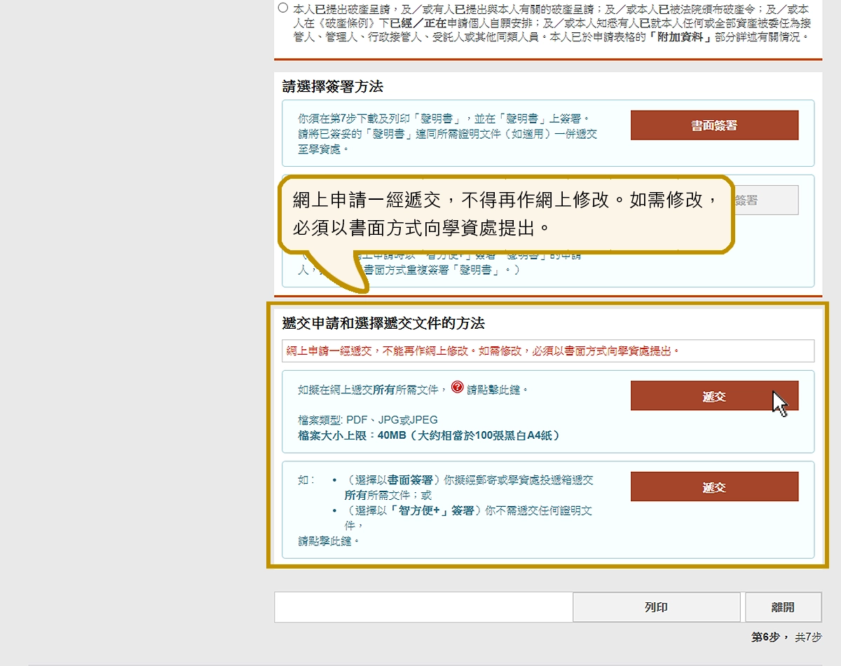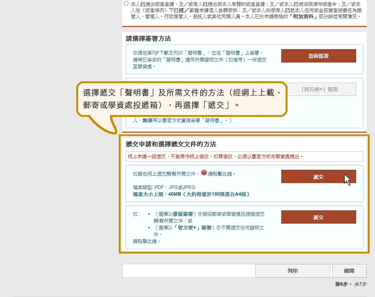 選擇遞交「聲明書」及所需文件的方法(經網上上載、郵寄或學資處投遞箱),再選擇「遞交」。
