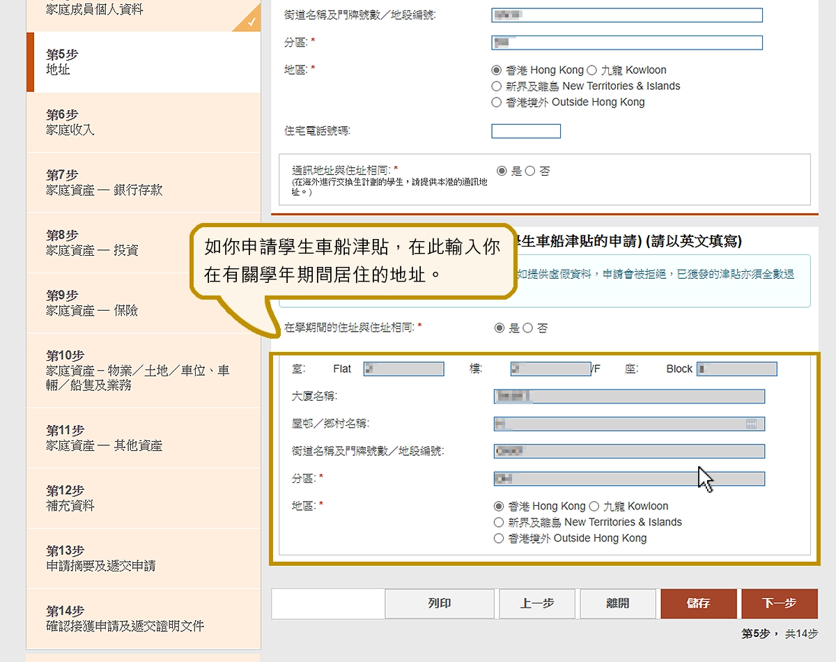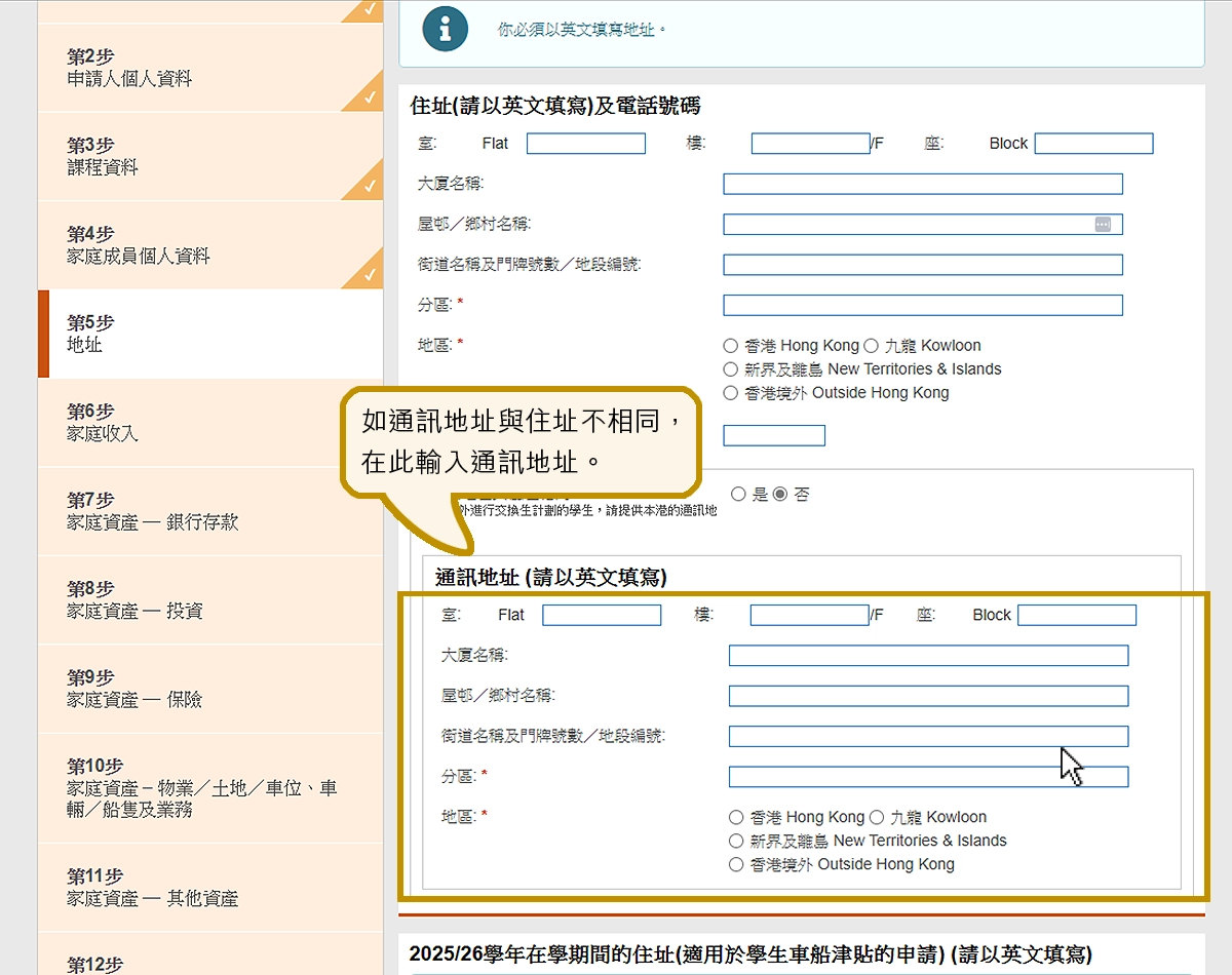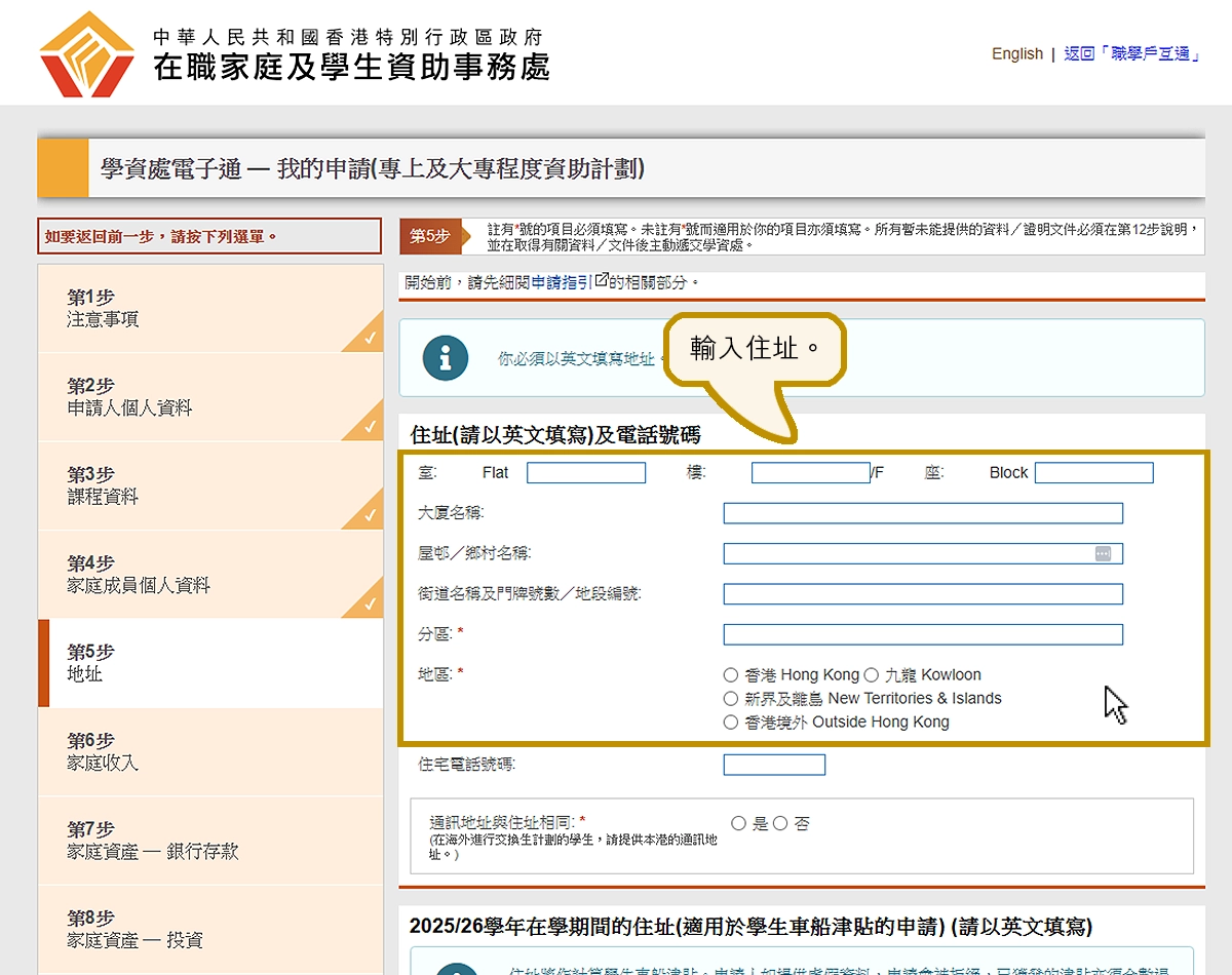 如你申請學生車船津貼,在此輸入你在有關學年期間居住的地址。